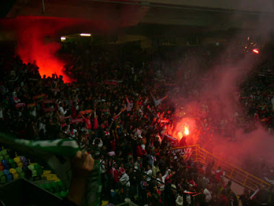 Foram cerca de 10.000 os presentes em Alvalade para um jogo de loucos. Além de uma massa humana fantástica (não me lembro de algo assim em Portugal) o apoio foi também muito bom, o que por vezes não acontece nestas situações. Com os grupos Benfiquistas bem distribuídos (os NN à esquerda, os DV no centro e o GM à direita) cada um ia puxando pelo sector e a maioria das vezes cantou-se em uníssono. Um excelente exemplo a seguir, Comparando com o anterior Derby, este foi bastante melhor em termos de apoio… até à catadupa de golos do Sporting.