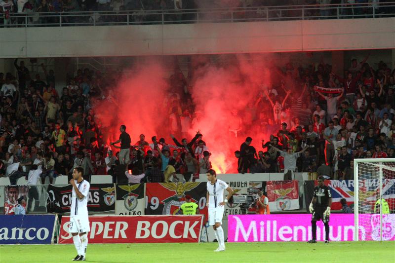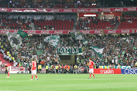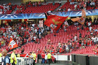 Na bancada vários destaques. Do lado leonino a boa organização vocal entre todos os grupos num jogo desta importância. Nesse aspecto dão cartas aos grupos da Luz. Bom apoio inicial mas após sofrerem os golos são muito poucos os grupos "tugas" que resistem. No entanto acho que acabaram por ter uma noite positiva. Um pote ali pelo meio deu alguma cor. A ausência de frases é que começa a ser uma constante, e nesse aspecto, os grupos leoninos estão a morrer...