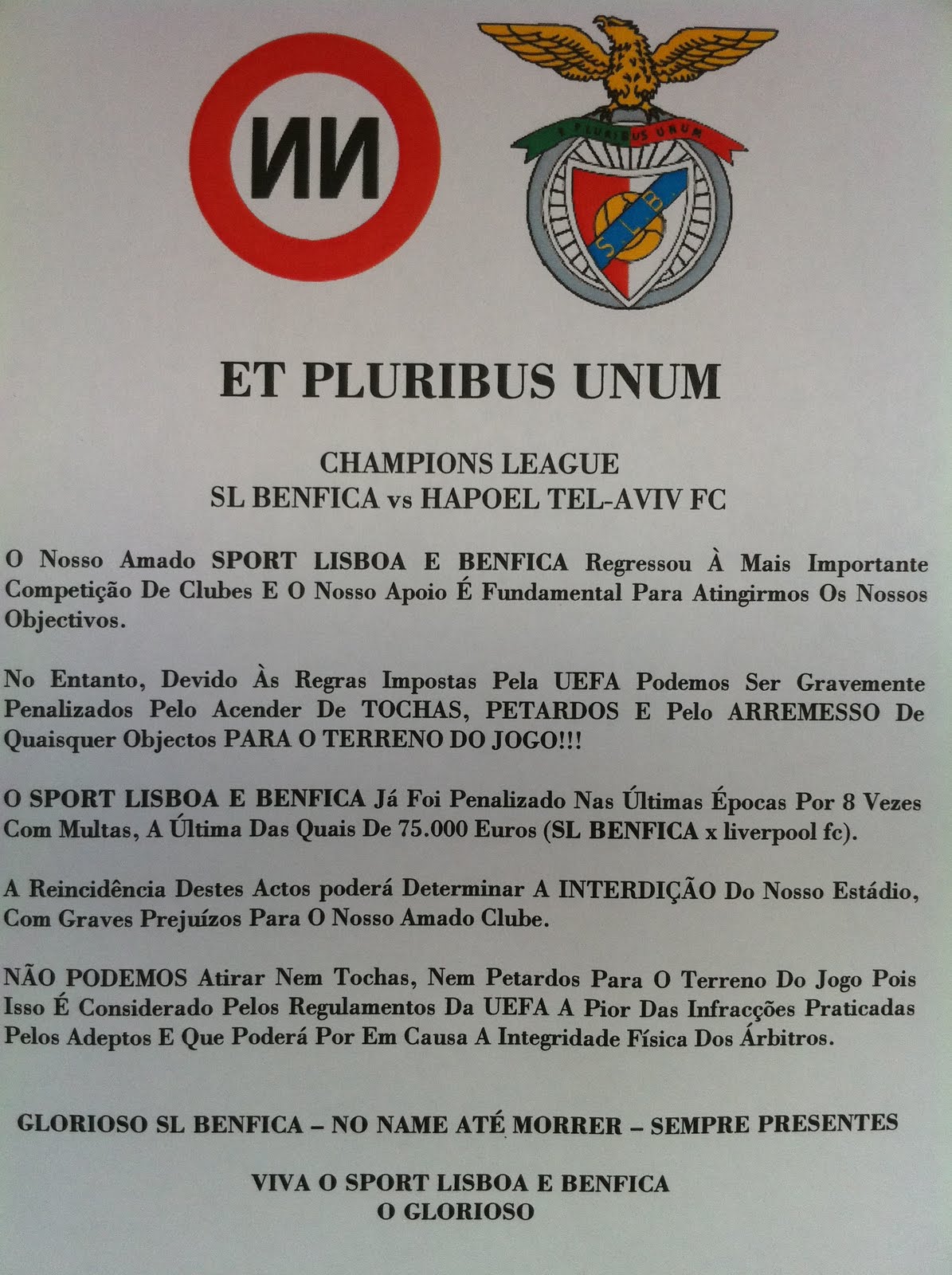Acabou por ser uma noite positiva para todos os grupos com um senão: mais uma vez andou política à solta na Luz. Tanto nos NN como nos grupos do Sporting... e mesmo a frase de tifo dos DV parece retirada de um mural da Festa do Avante...